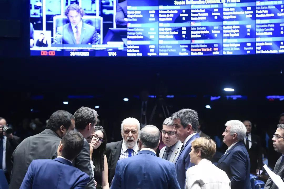 Senadores a favor e contra o projeto dialogam durante a sessão. Foto: Jefferson Rudy/ Agência Senado